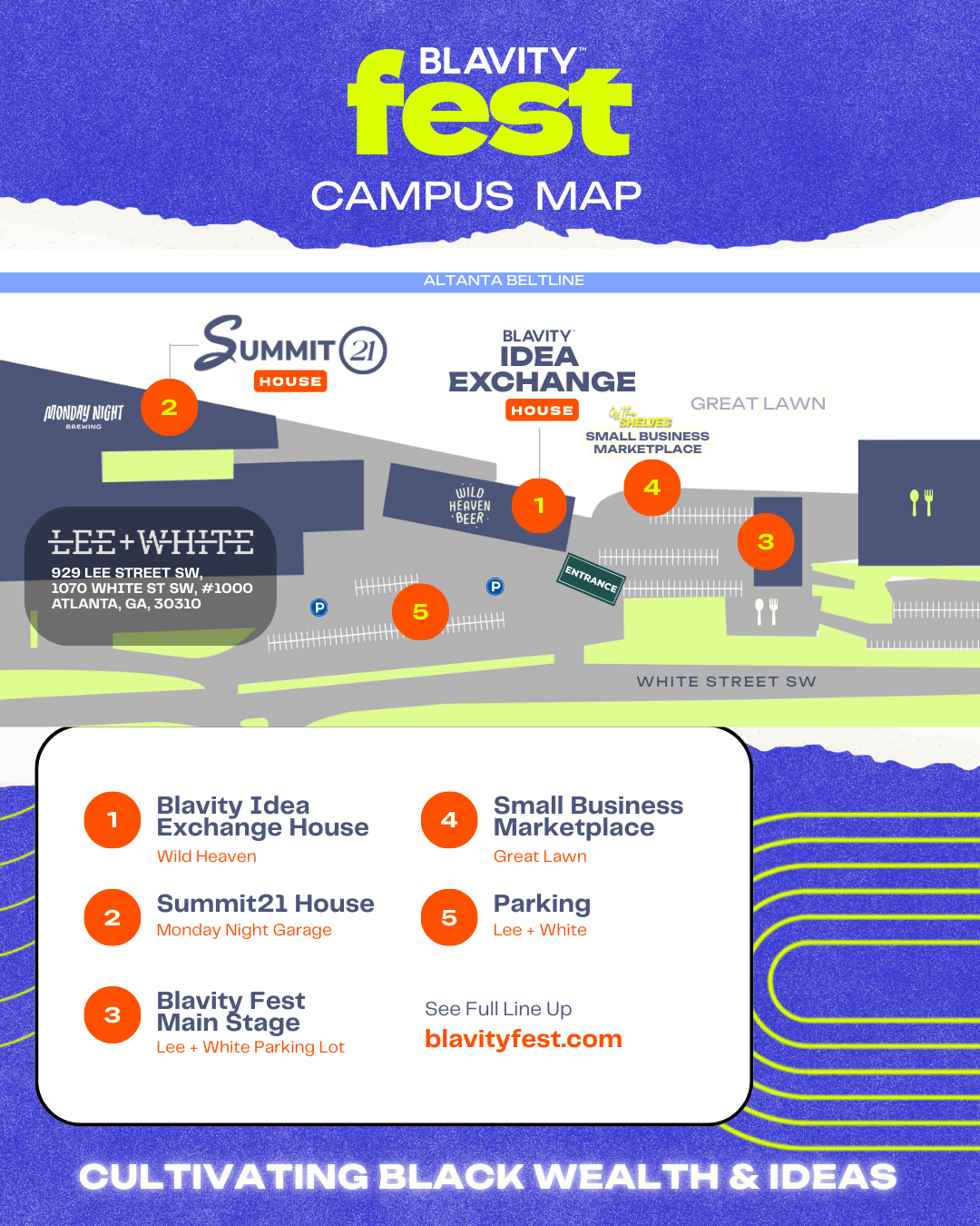 Use the campus map to locate stages, lounges, and key experiences throughout Blavity Fest.